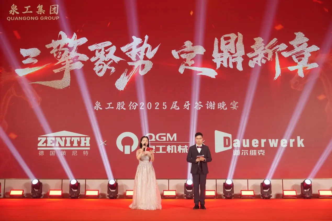 Sa hapon ng ika-3 ng Pebrero,Fujian Quangong Machinery Co., Ltd.idinaos ang 2025 Annual Summary and Awards Ceremony at New Year's Celebration nito sa Quanzhou Donghai Honor Hotel, sa ilalim ng temang "Three Engines Converging, Setting a New Chapter." Ang mga pinuno ng kumpanya, pangunahing kinatawan ng customer, lahat ng empleyado, at kanilang mga pamilya ay nagtipon upang suriin ang paglalakbay ng pagsusumikap, ibahagi ang mga tagumpay sa pag-unlad, at umasa sa isang magandang kinabukasan.